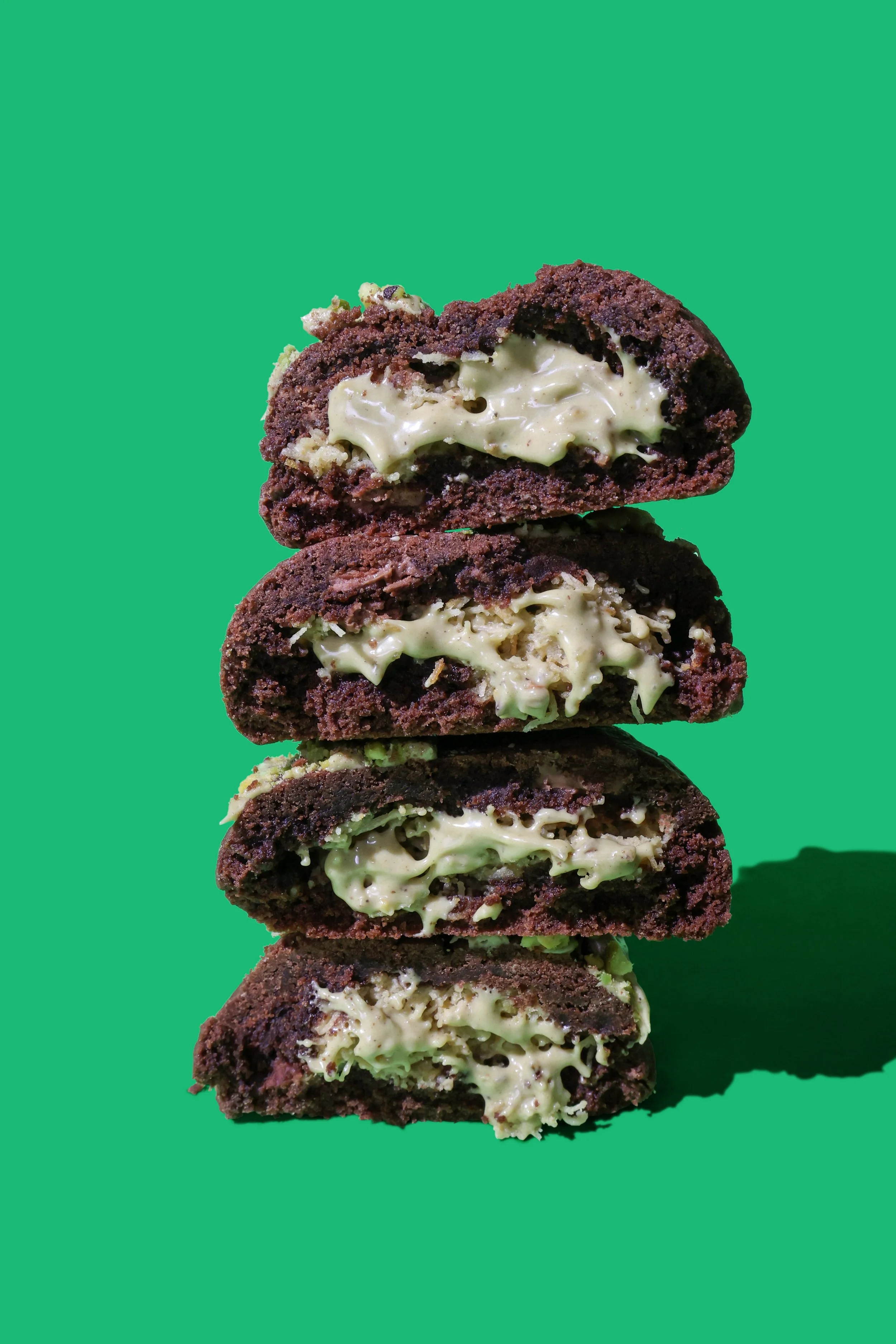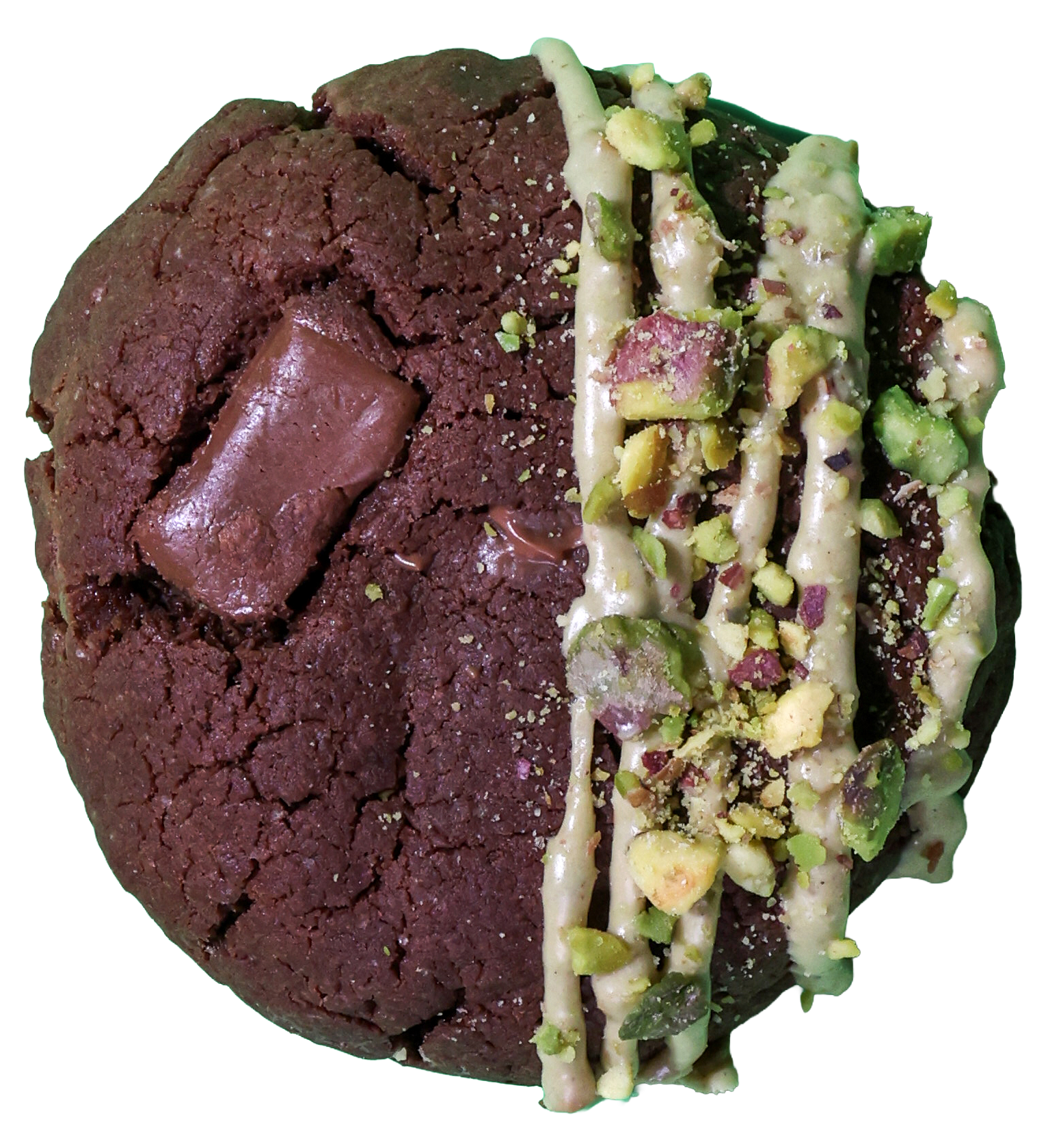 Cookies al cacao e cioccolato al latte, con cuore crema di pistacchio e pasta Kataifi.